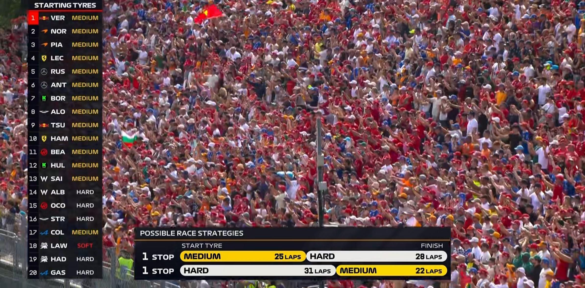 起步轮胎方面:中性胎成为主流选择,劳森使用软胎,其余后方的车手选择硬胎;