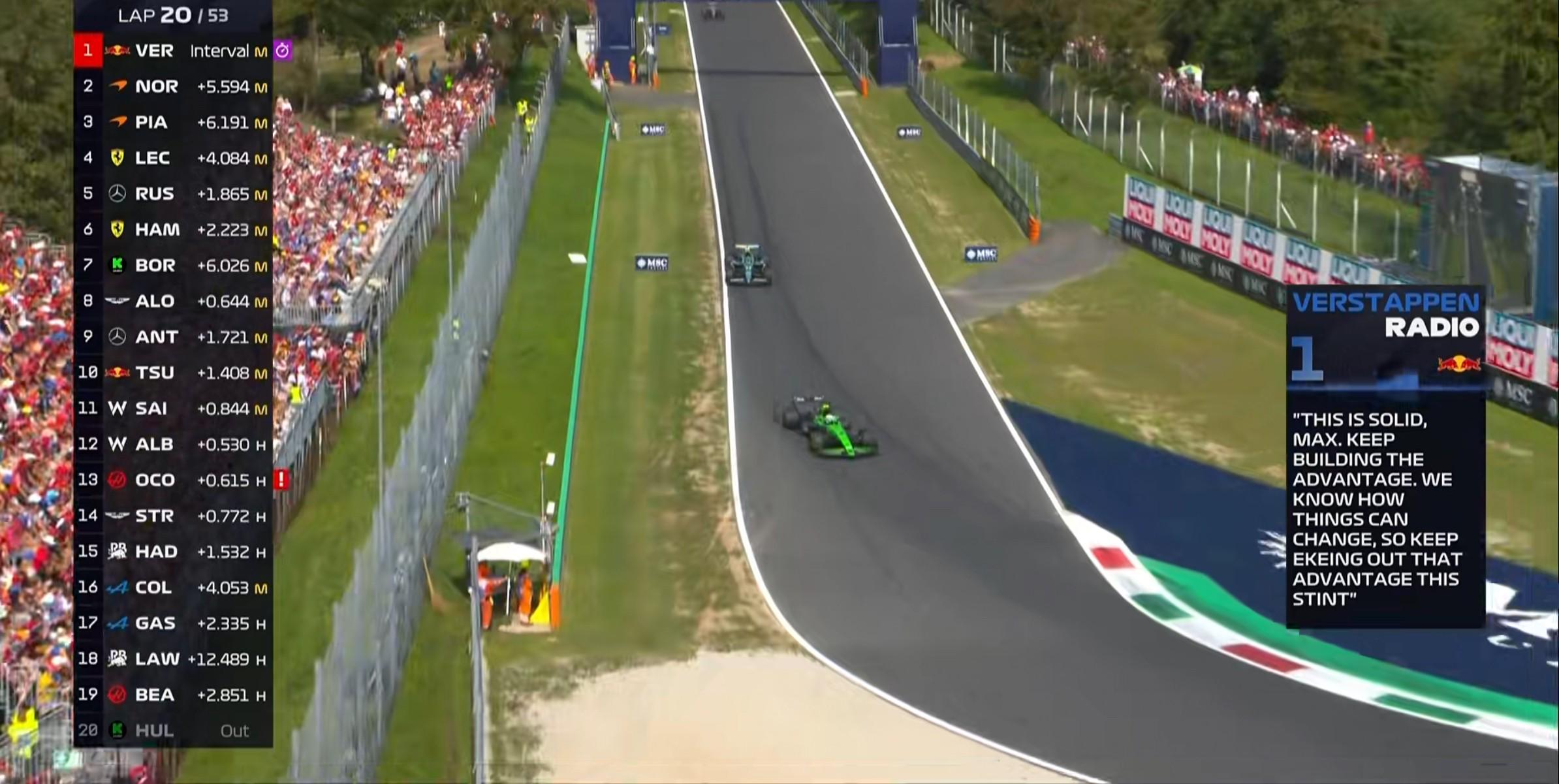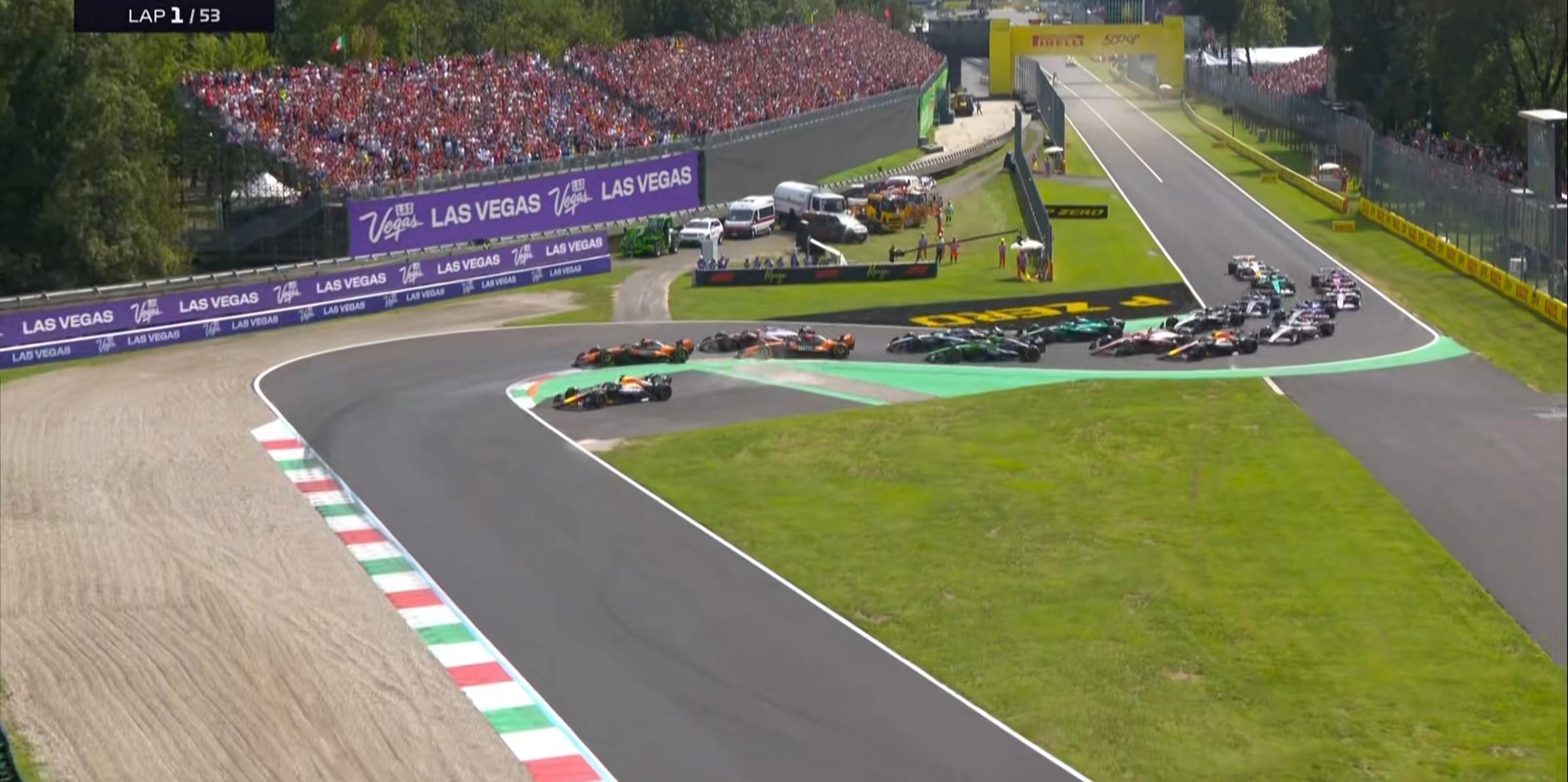 第2圈:车队要求维斯塔潘归还位置,他也在1号弯的直道前放过诺里斯!