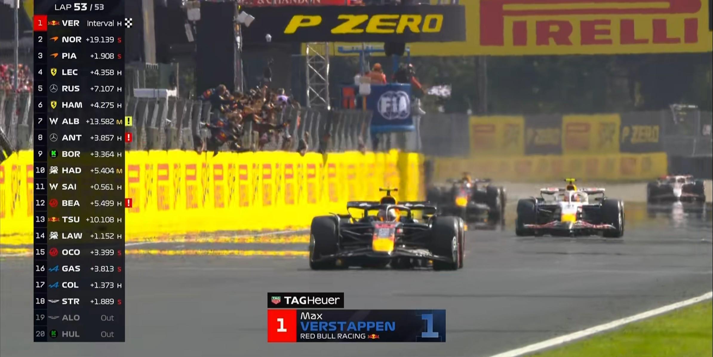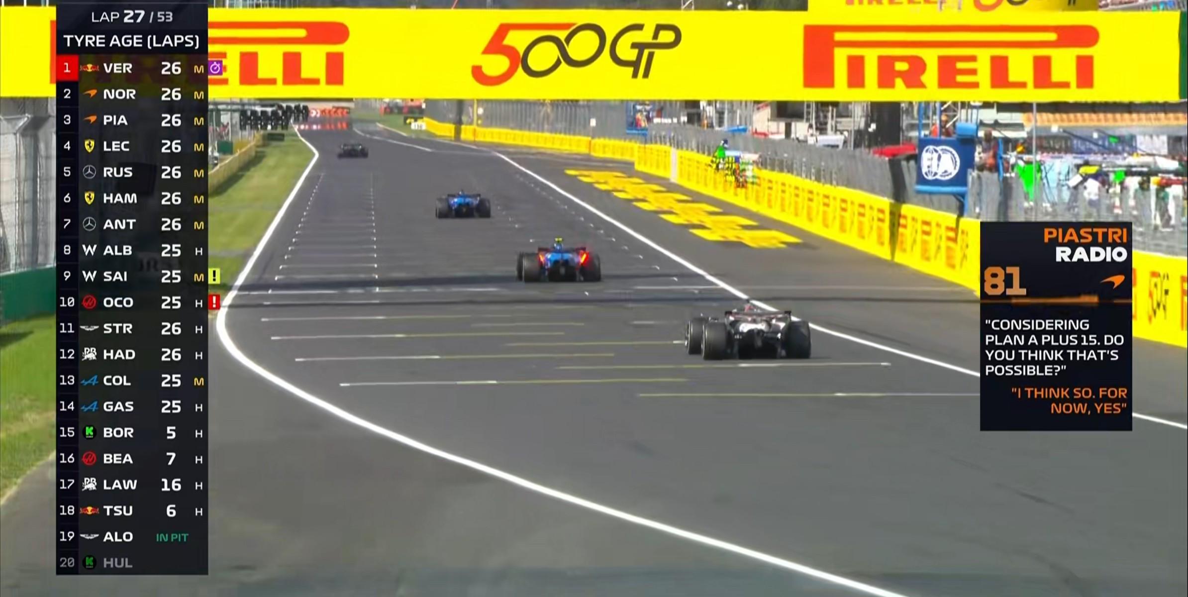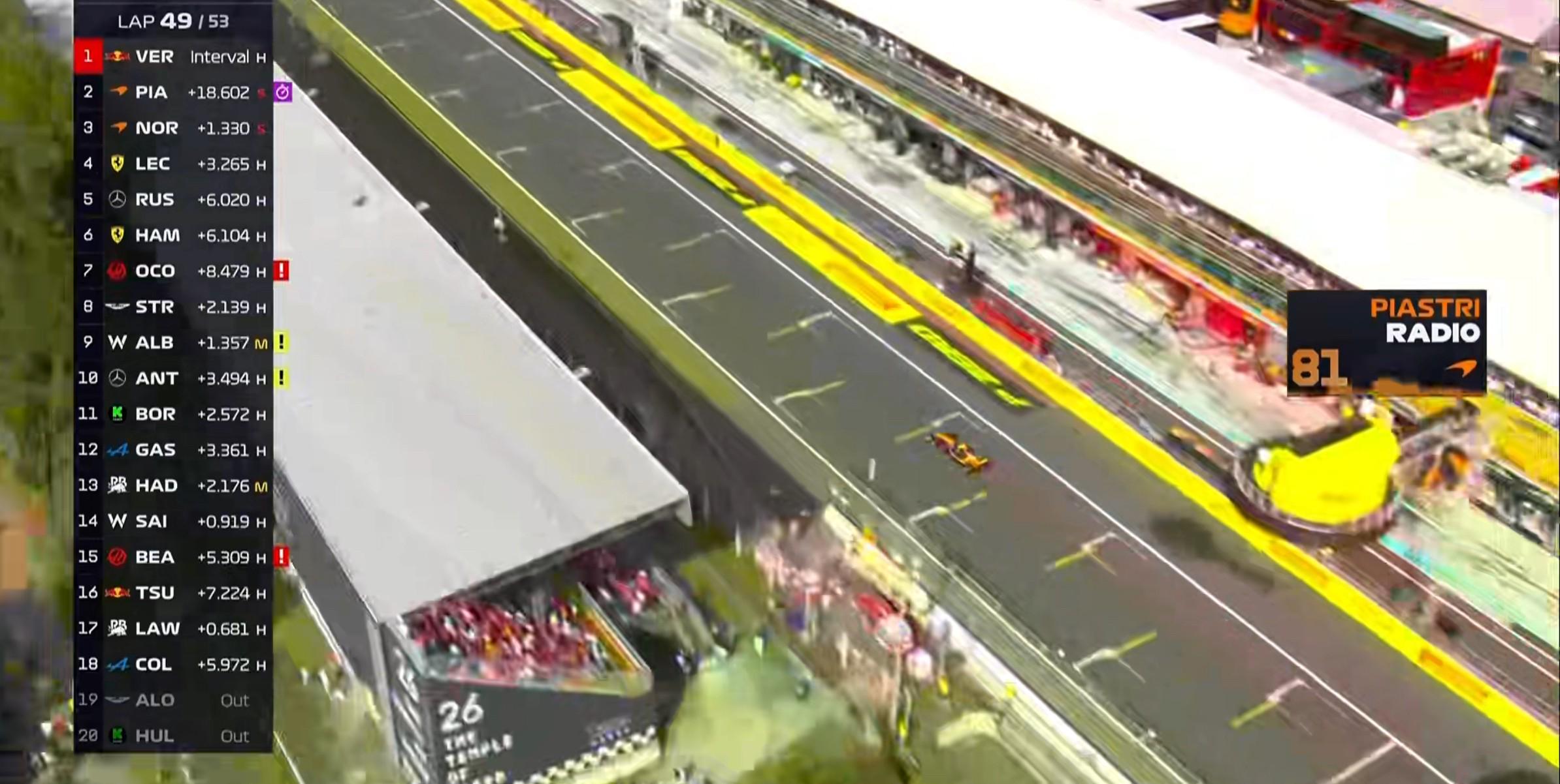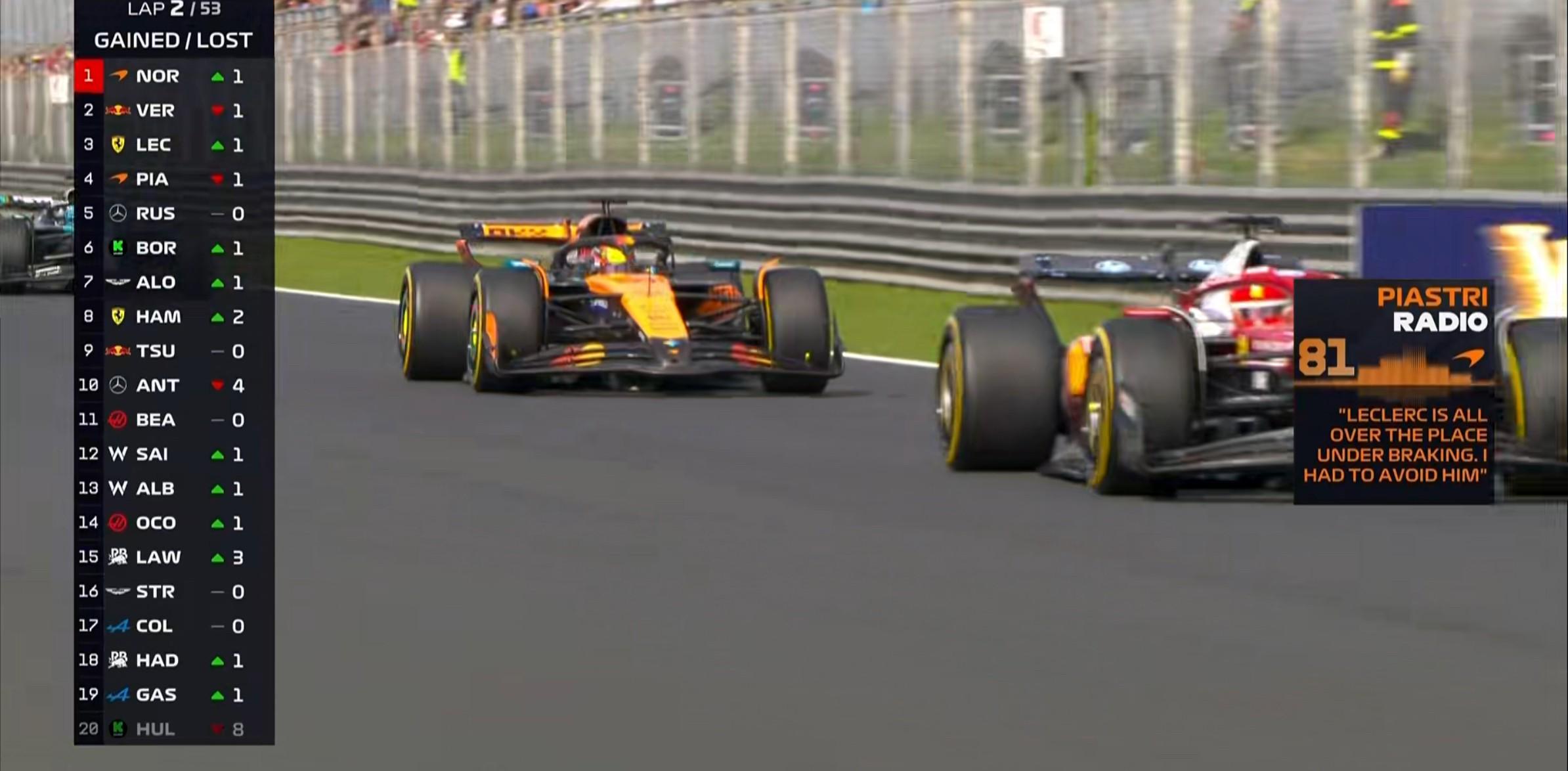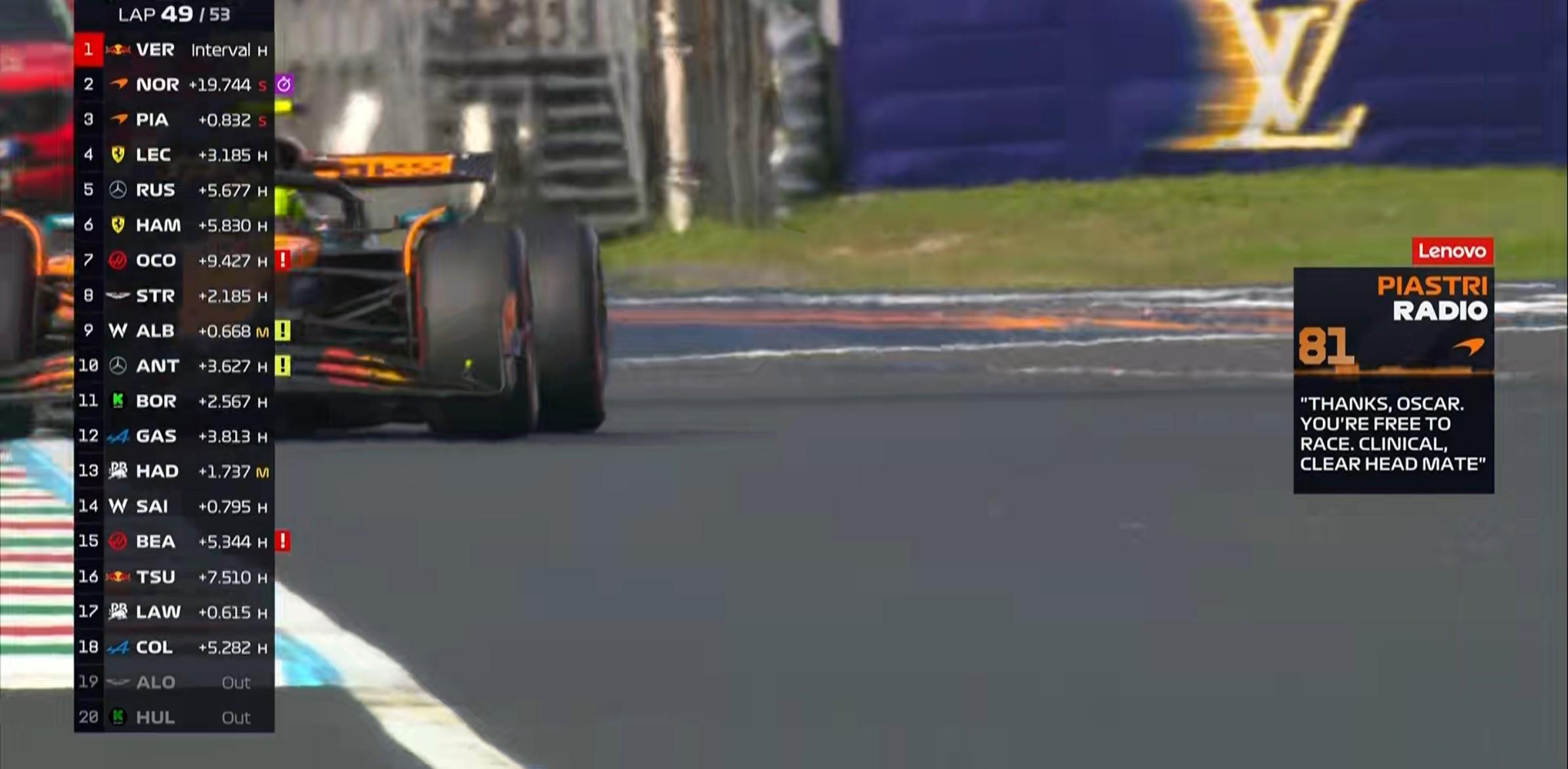第49圈:车队告知皮亚斯特里目前的情况与去年的匈牙利站很相似,车队的原因导致出现了这样的情况,因此车队要求皮亚斯特里在1号弯前放过诺里斯!