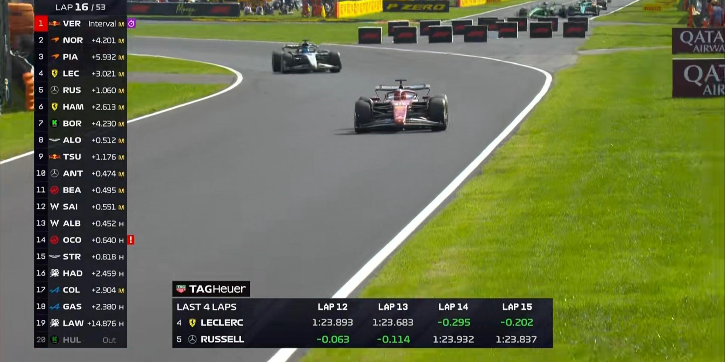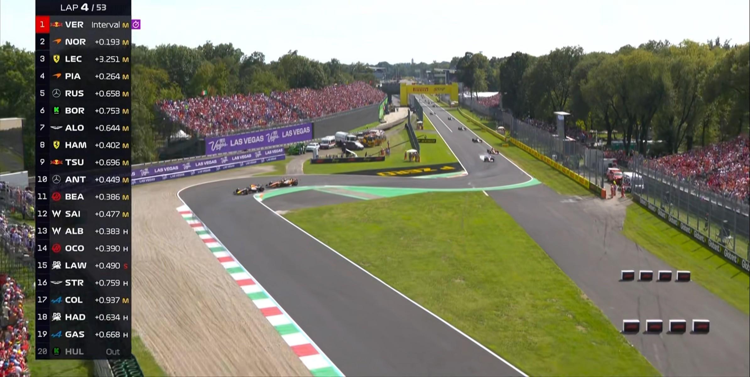 第4圈:维斯塔潘在1号弯前超越诺里斯,勒克莱尔在防守的过程中走大遭到皮亚斯特里的投诉!