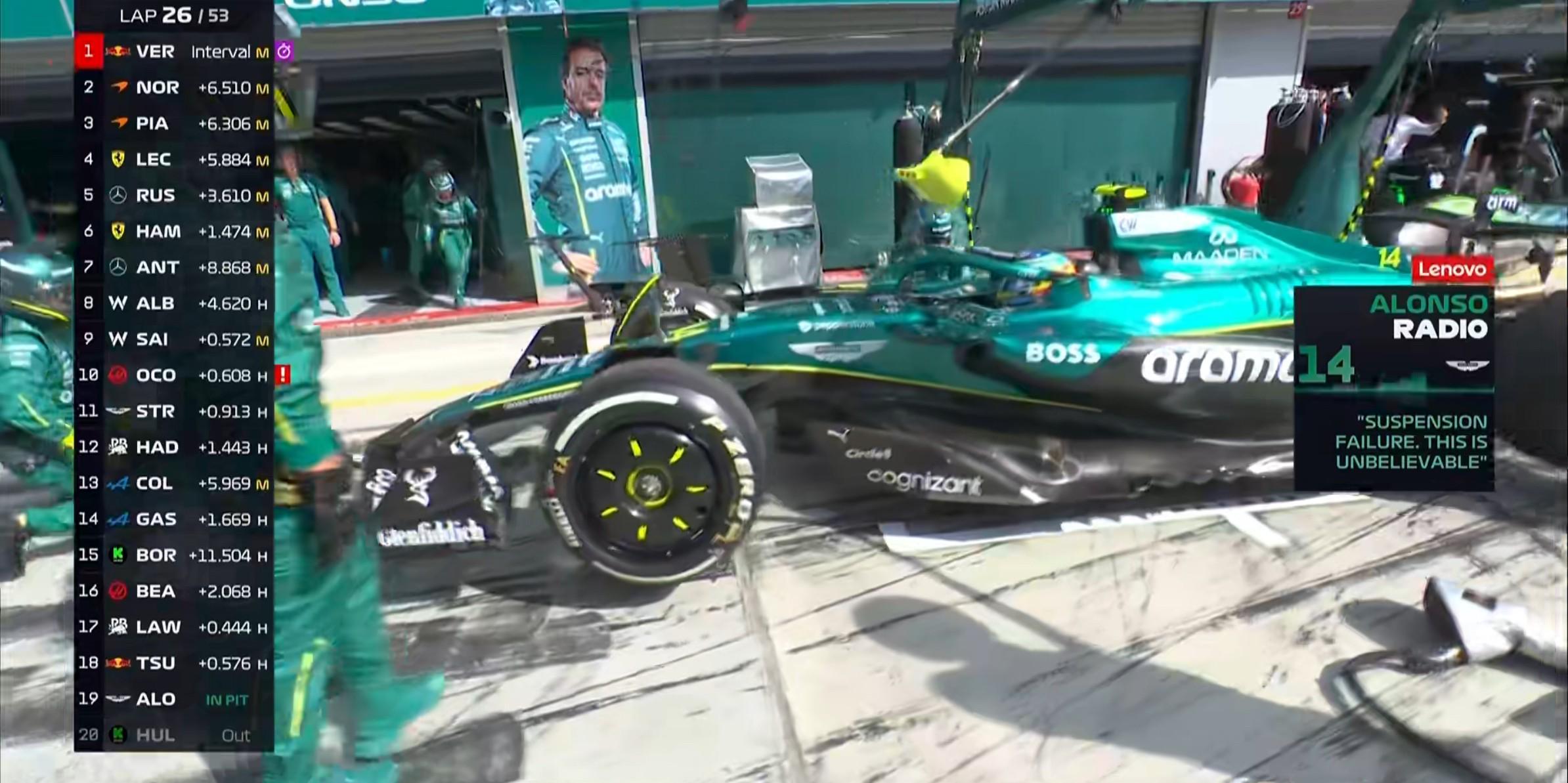 第26圈:阿隆索将赛车慢慢开回维修区退赛,安全车未出动!