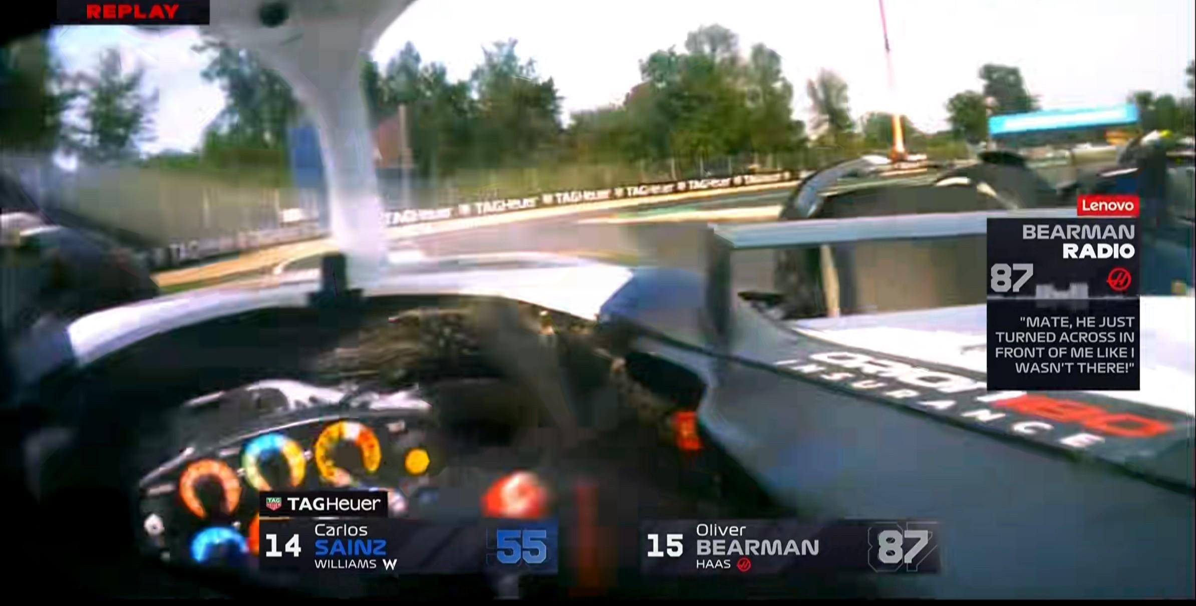贝尔曼表示塞恩斯的突然出现导致了他的追尾,但从回放来看塞恩斯在进弯前已占据车头的领先;
