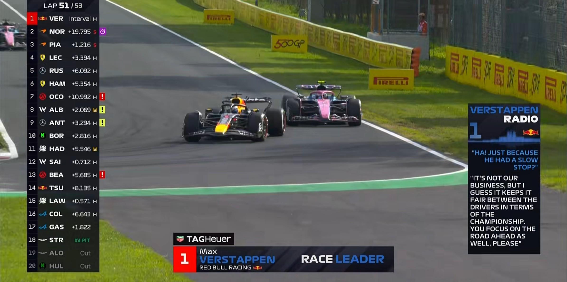第51圈:车队告知维斯塔潘两台迈凯伦完成位置互换,维斯塔潘立马猜到是因为进站失误导致的变化;