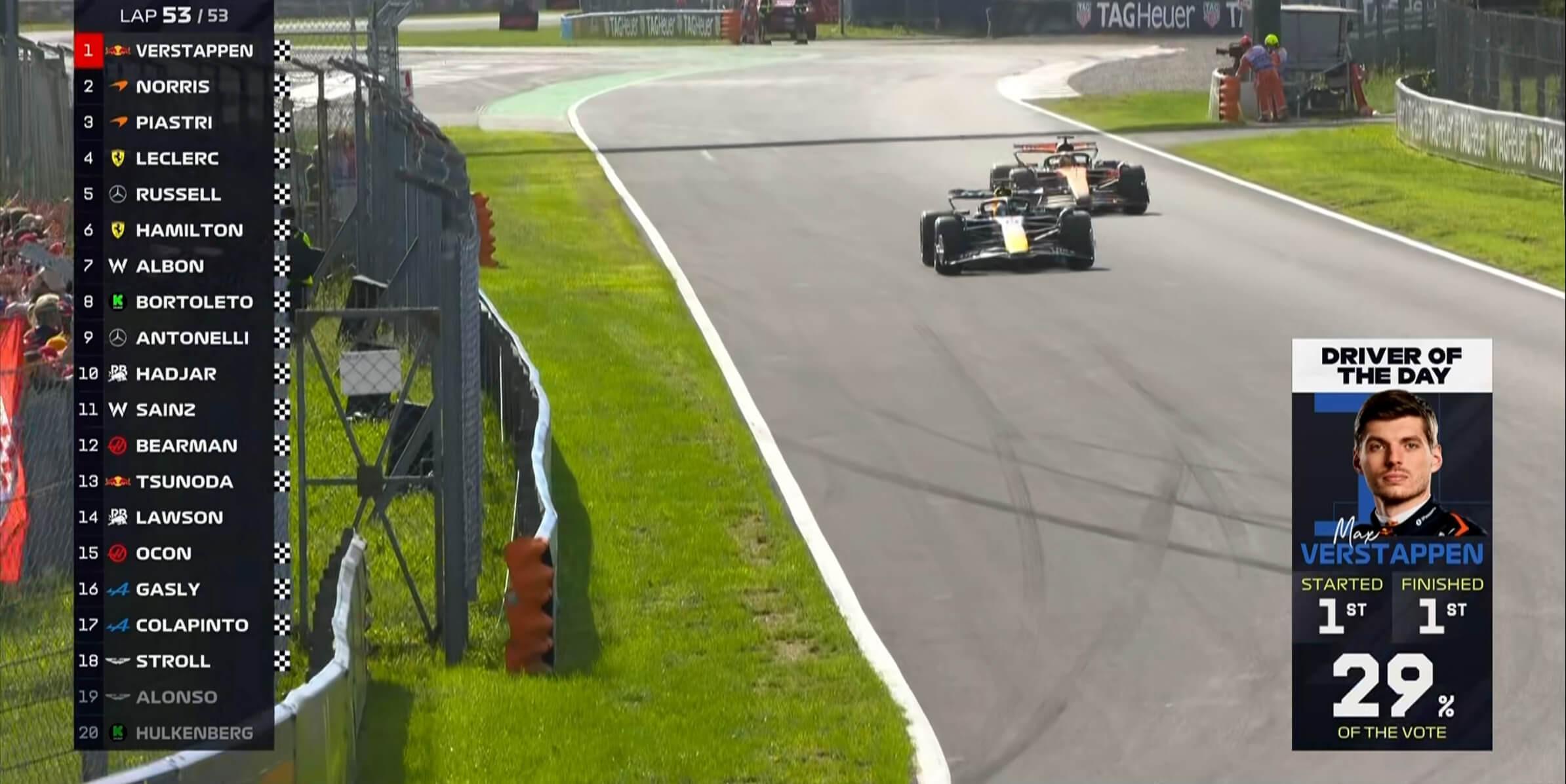 冲线!维斯塔潘全场表现非常稳定,杆位起跑拿下意大利站的冠军!